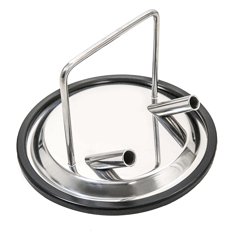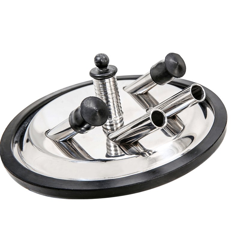 En acero inoxidable AISI 304 con sellado en goma, con 1 entrada para conjunto de ordeño y una entrada para manguera de vacío.