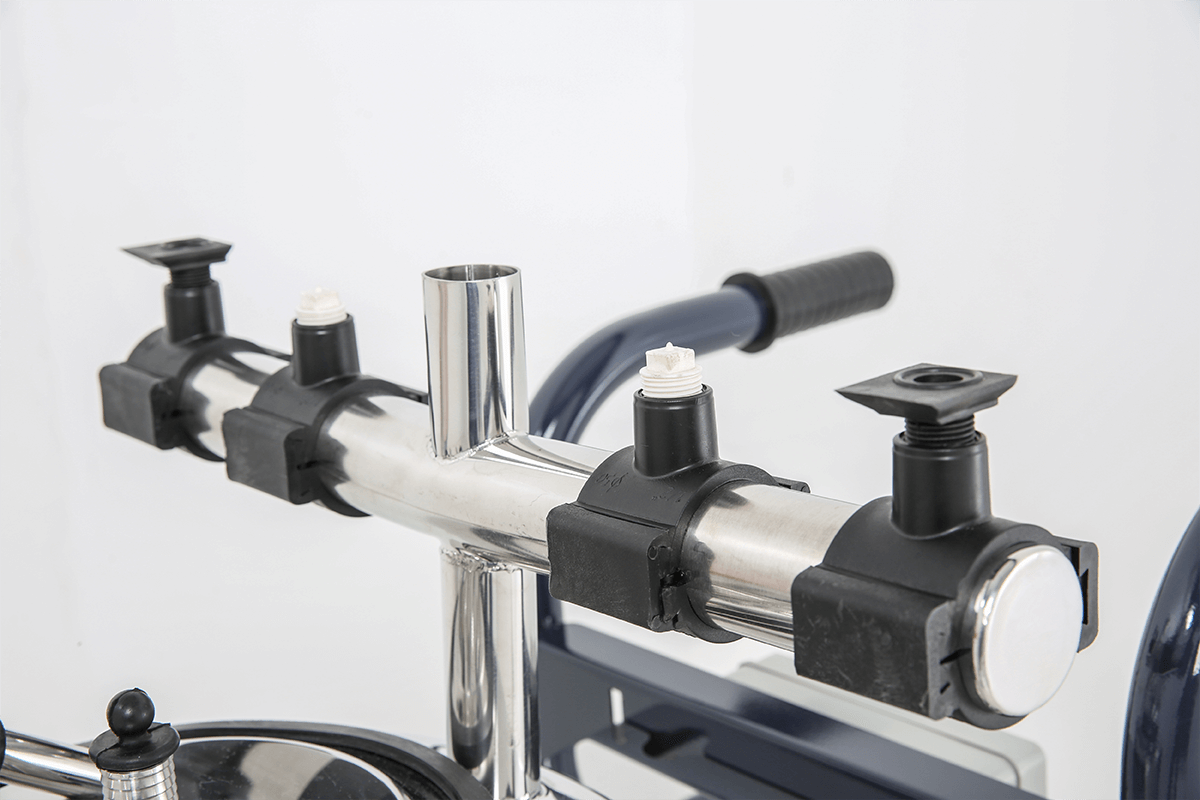 Tubo en acero inoxidable AISI 304 con diámetro de 50mm, posee 4 acompalmientos individuales para pulsador y 1 acomplamiento para manguera de vacío de 11/2”.